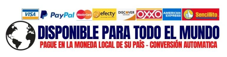 Puedes realizar tu pago dando clic en el botón comprar, puedes pagar con tarjeta de crédito, débito, PayPal, Oxxo, Pagos en efectivo, Efecty y transferencia bancaria.